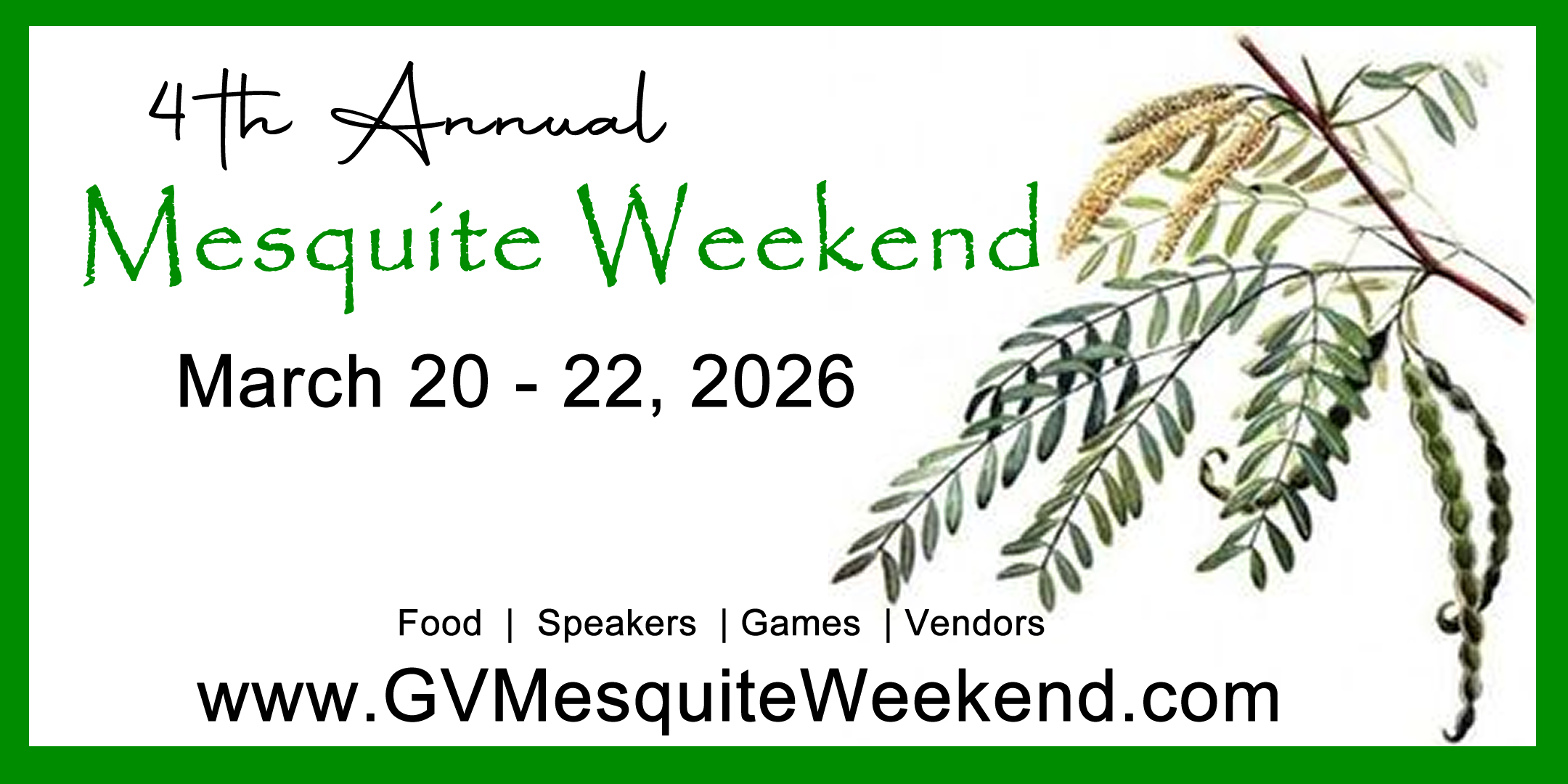 Peggy Sue Sorensen of The Desert Kitchen will be giving a workshop on this amazing food source. She will show you how to identify a Mesquite tree, as well as how to harvest, store and process the bean pods. She will also demonstrate how to prepare them into some yummy treats that you will be able to sample.