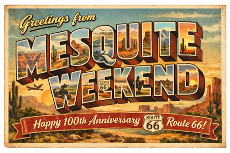 It used to be called “The Main Street of America”. We are so proud and happy that Golden Valley is on that main street. To share our pride in being part of Route 66, we are offering a Mesquite Weekend Route 66 postcard done in the same style as the old, original promotional style. You can buy one individually or you’ll get one included in your tote bag if you buy a BRILLIANT Ticket.